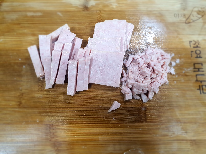 사각햄도 사각형모양, 길게 채썰고 나머지는 잘게 다졌습니다.